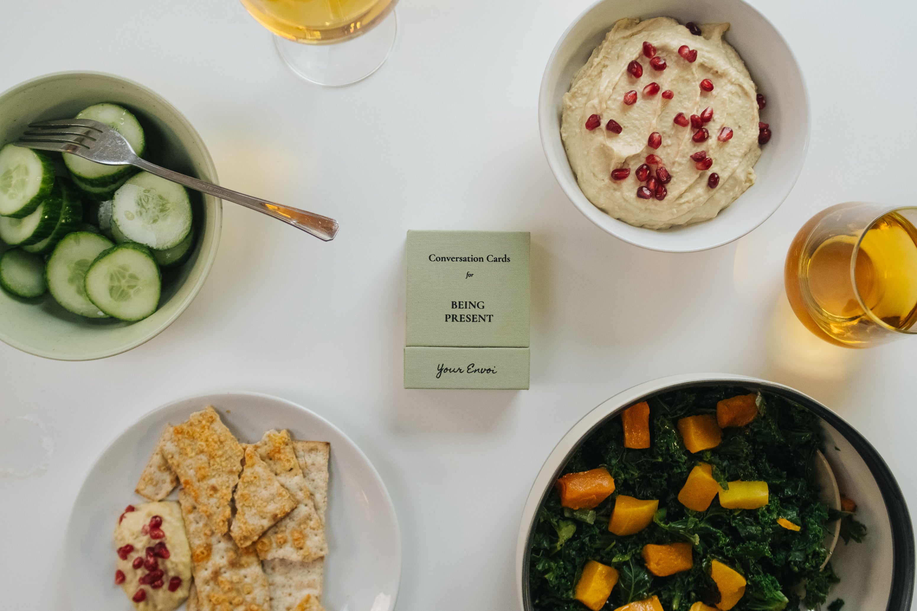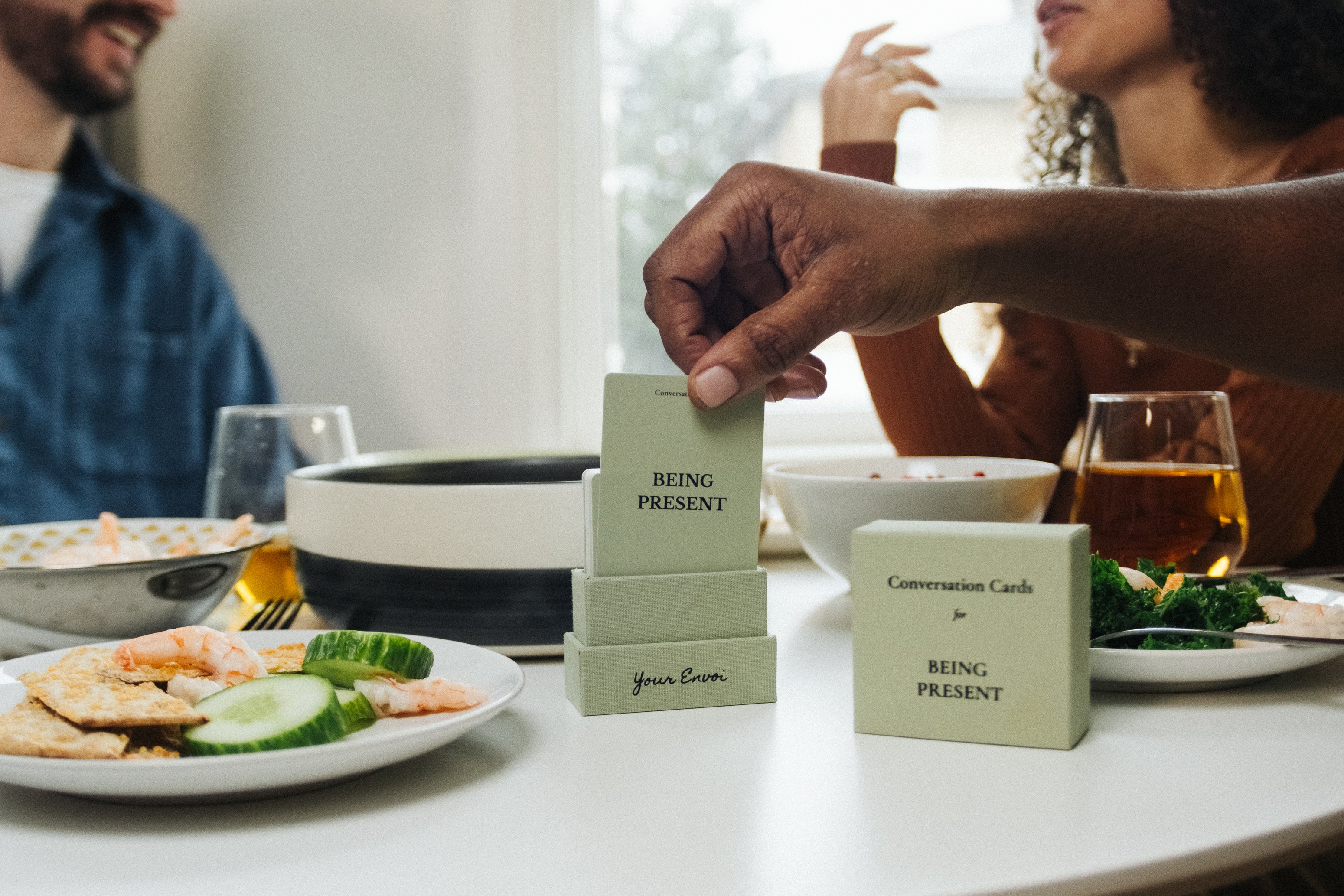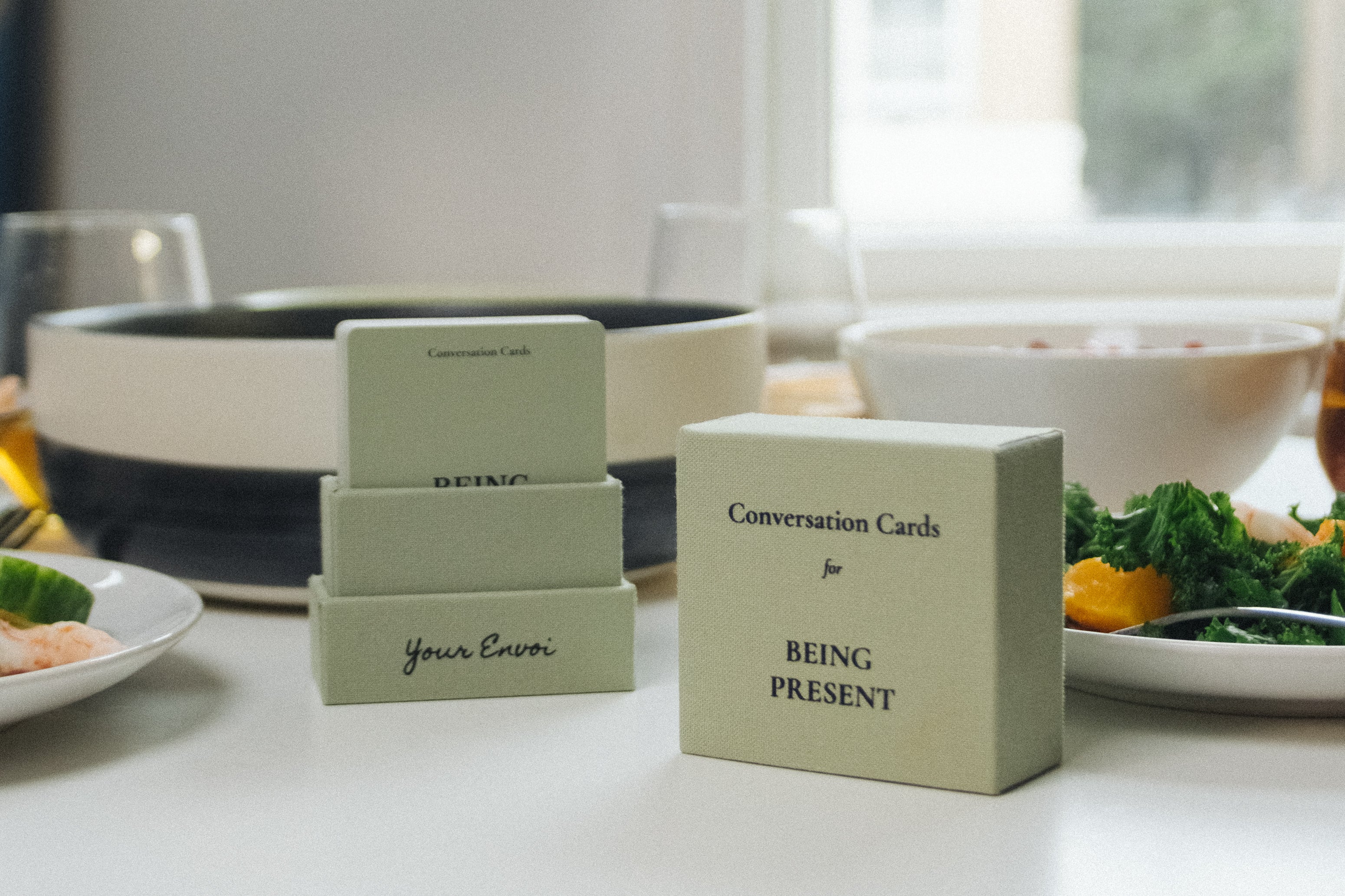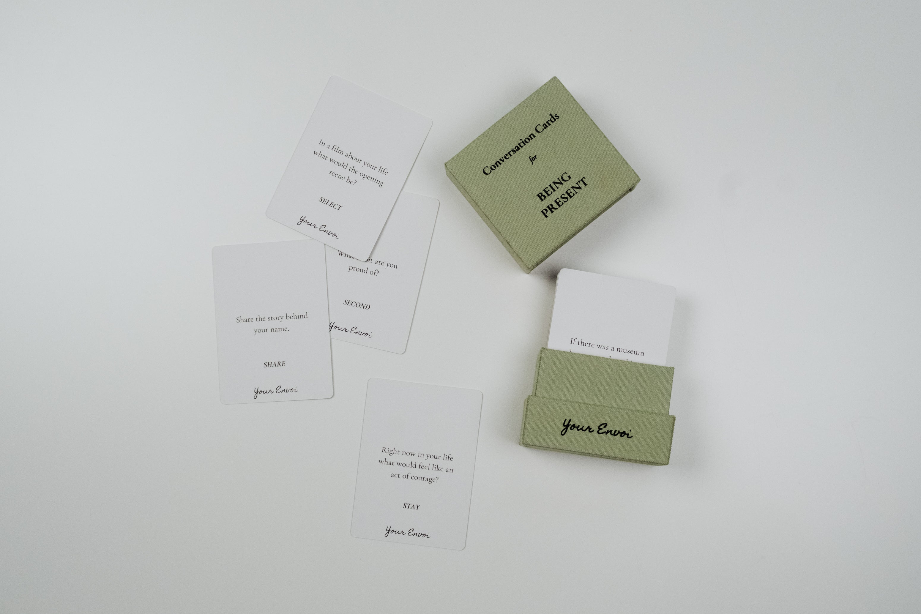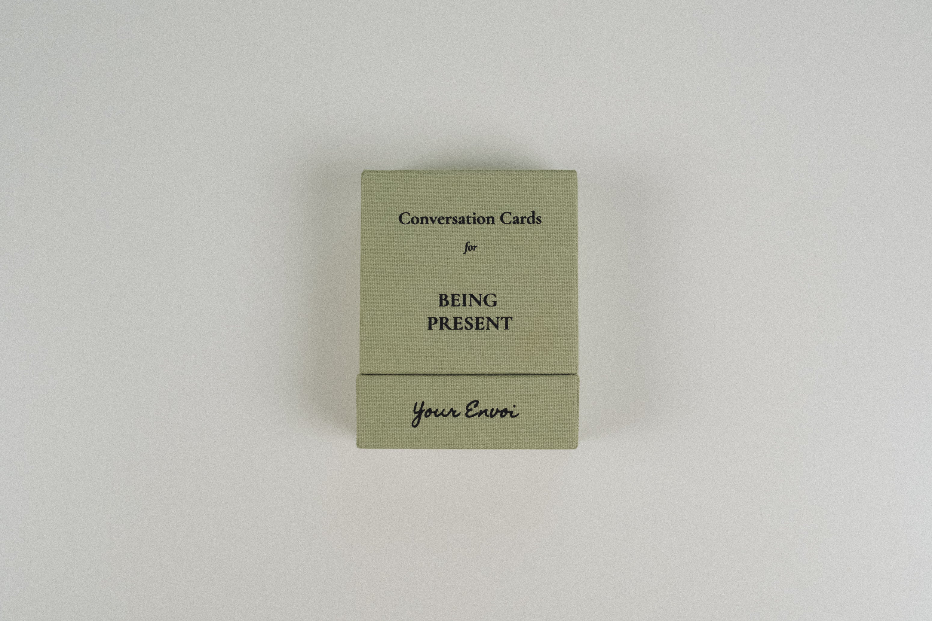Being Present is filled with imaginative and insightful questions to bring fresh answers, new perspectives, and deeper connections. The format has been curated to offer a dynamic experience that keeps you actively listening. Our smooth fabric box holds 52 premium cards.