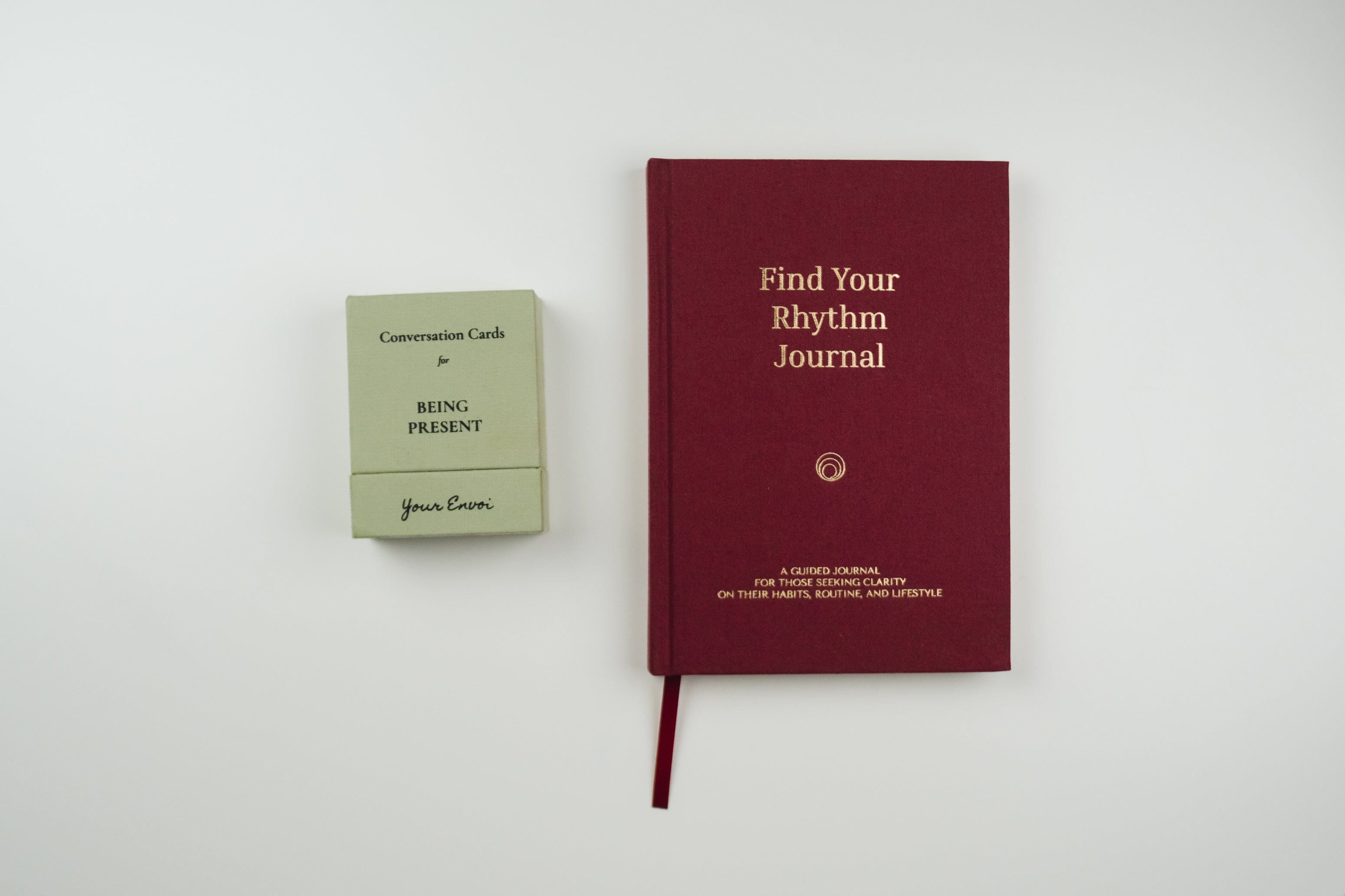 Tools to bring depth to your time of connection, whether with yourself, or when spending time with others. The bundle includes our first collection, Being Present Conversation Cards and Find Your Rhythm Journal. Being Present is a set of imaginative and insightful conversation starters, while Find your Rhythm is a guided journal with daily reflections and review pages helping you live with more balance and intention.